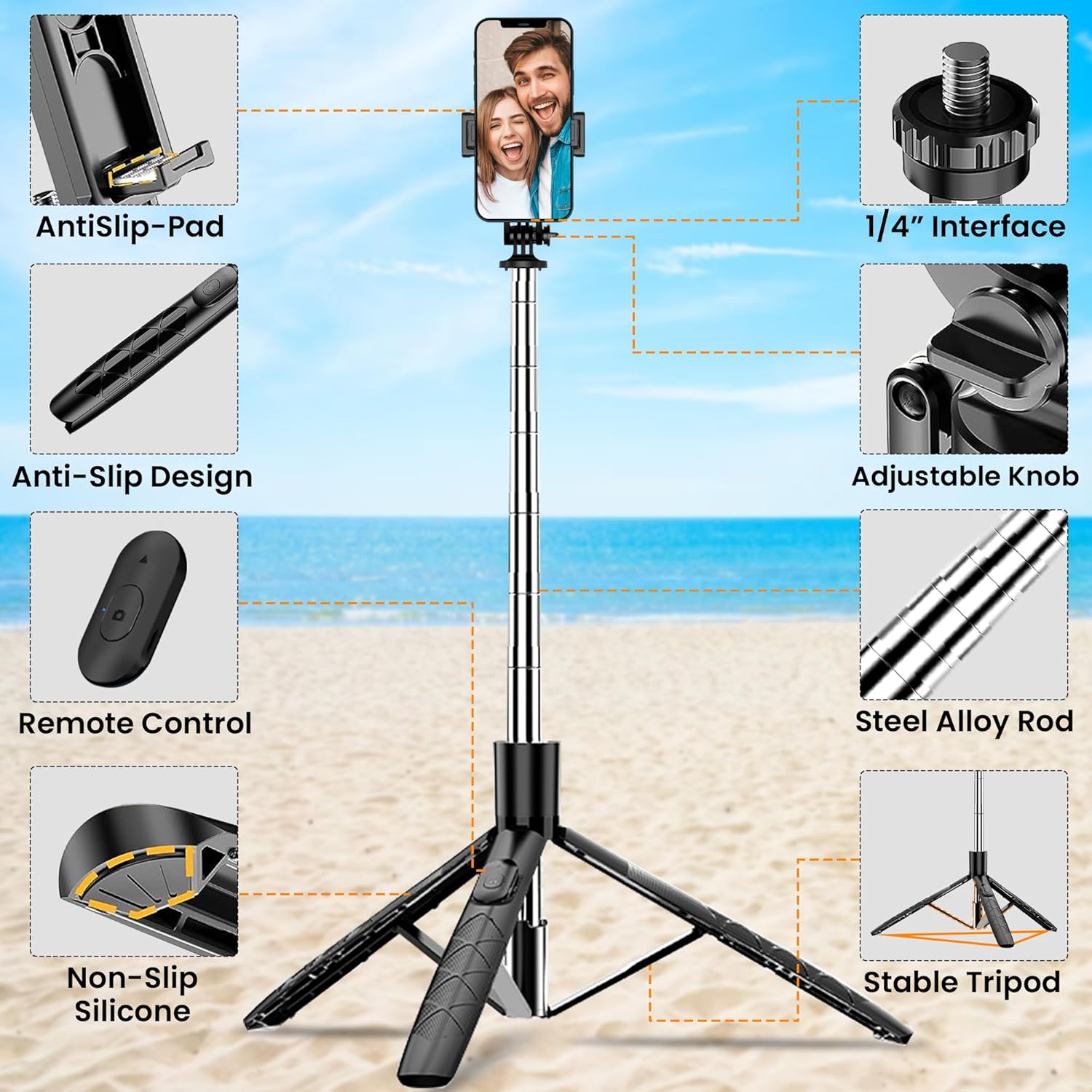 - Upgraded Long Telescopic Pole tripod for phone with 7 Adjustable Sections, perfect for capturing those wide-angle shots and faraway moments. This Long selfie stick can be adjusted from 33cm to 180cm to capture wider landscape with different heights