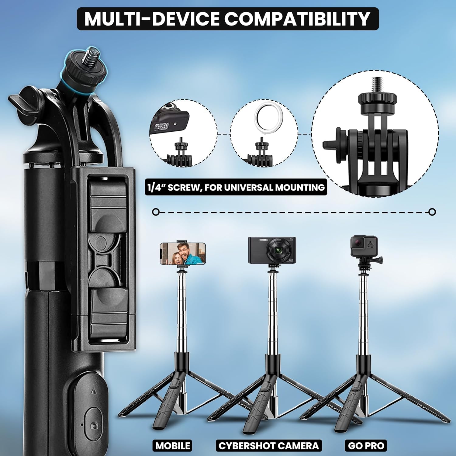 - Selfie Stick for mobile phone with 1/4 Interface compatible with multiple devices including GoPro, camera, ring light, and twin lights. This versatile feature allows for seamless integration with your existing photography and videography